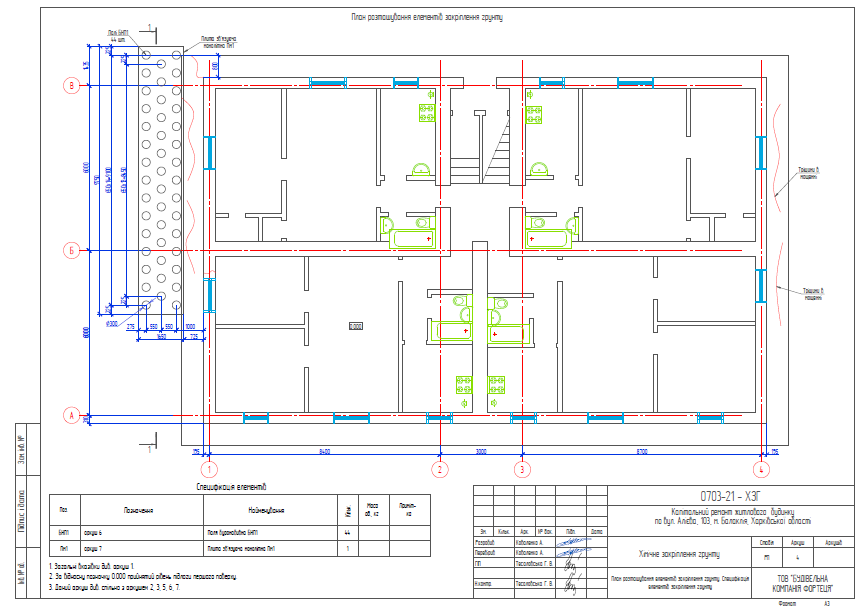 Performed a project to strengthen the foundations of the foundation of a residential house. House began to crack on the bearing walls. Specialists established the cause and developed design solutions to repair and strengthen. Several variants of solution were offered and individual approach and technical capabilities of work execution were taken into account. Fragments are provided by Aliev’s dwelling house in Balakleya.
